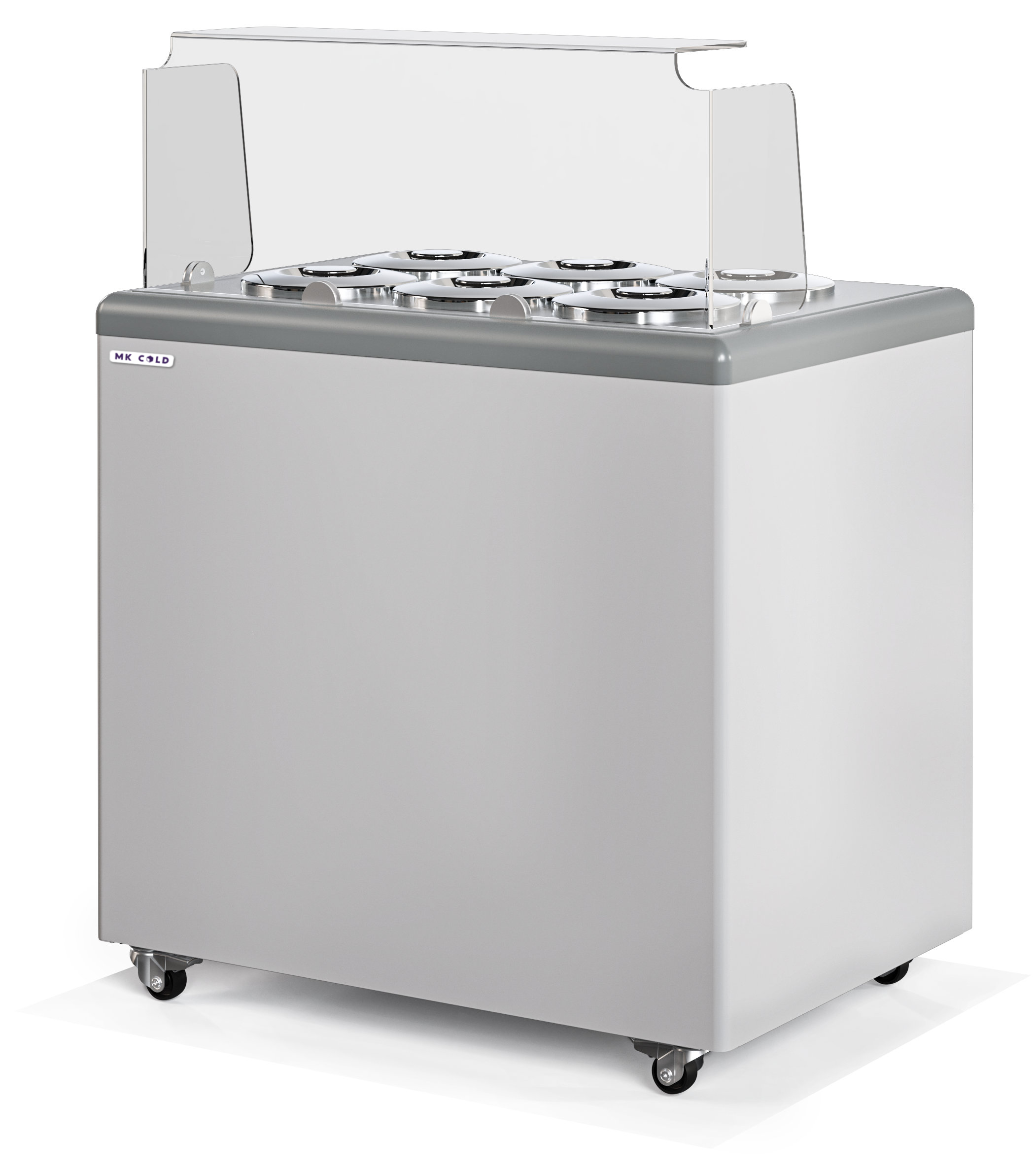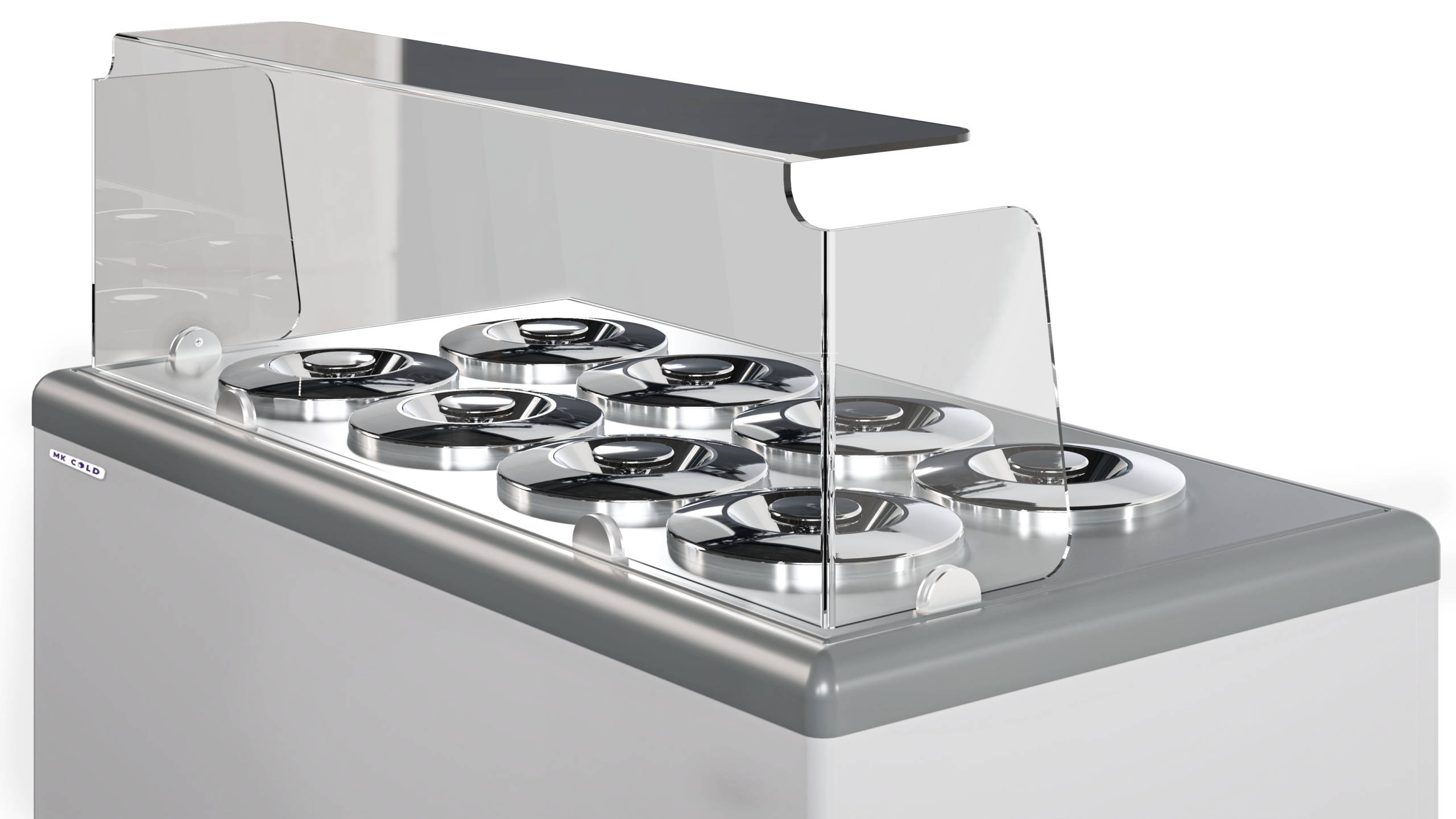 - Wyposażona w ochronną szybę plexi ułatwiającą wydawanie lodów